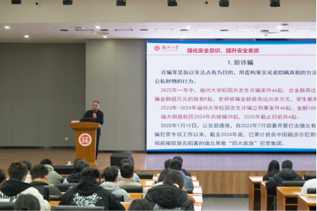刘老师从财产安全、人身安全、国家安全、网络安全等方面为同学们详细讲解了大学生活中的安全风险及防范要点。在讲座过程中,刘老师多次利用发生在校园的真实事件作为警示案例,引起同学们的警醒与思考,大大提高了同学们对安全风险的认知和防范应变能力。最后,刘老师呼吁同学们要重视安全,谨慎防范,及时求助,共同营造安全稳定健康的大学生活环境。