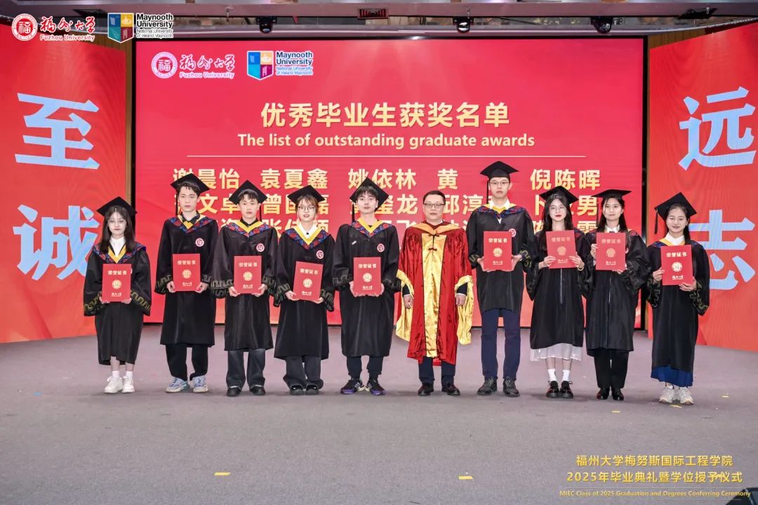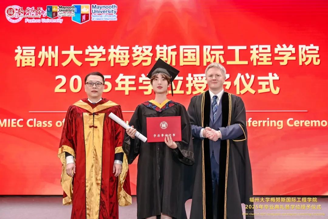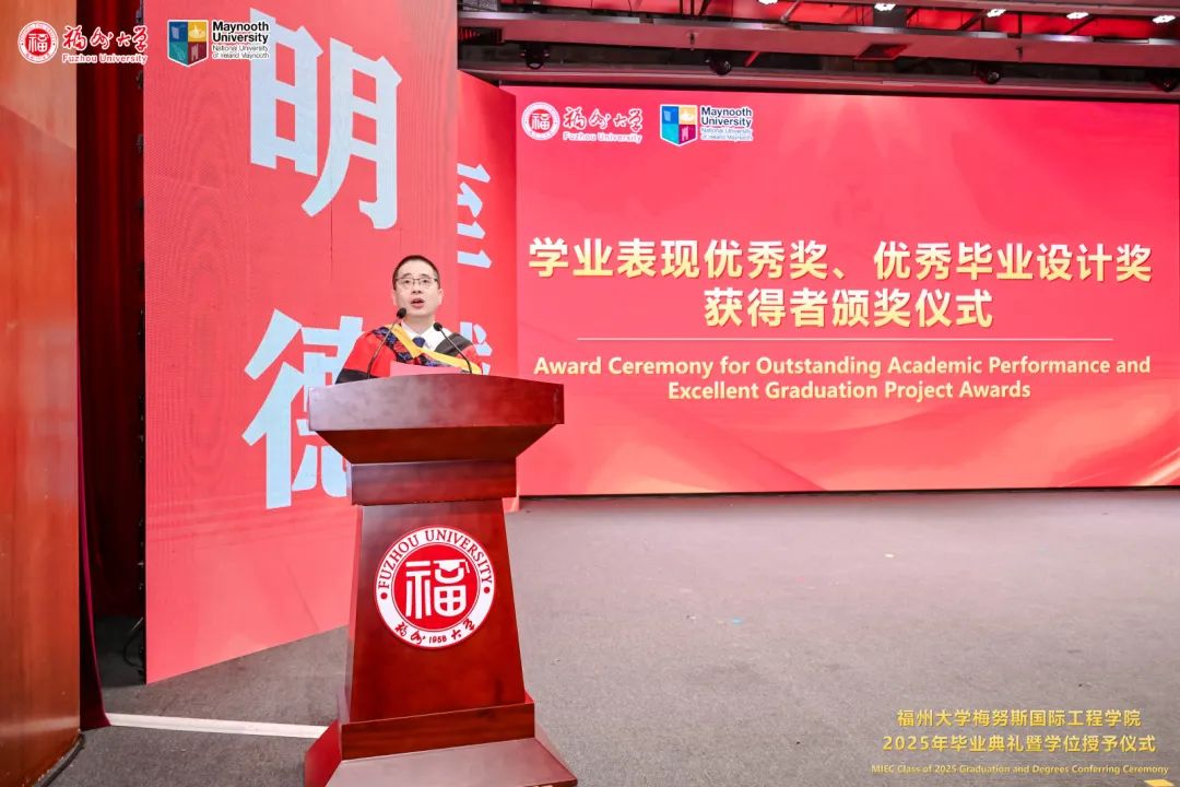 院长杨黄浩教授、学院党委翁穗平书记、常务副院长方捷教授、学院党委王涛副书记、副院长黄彩进教授出席本次典礼。爱尔兰国立梅努斯大学学术副校长、注册主任 Ronan Farrell教授、国际事务副校长Patrick McCole教授率梅努斯大学代表团,不远万里专程出席本次典礼。参加典礼的还有中外方教师、家长代表和全体2025届毕业生。典礼由学生代表杨冰旭和王慧婉双语主持。