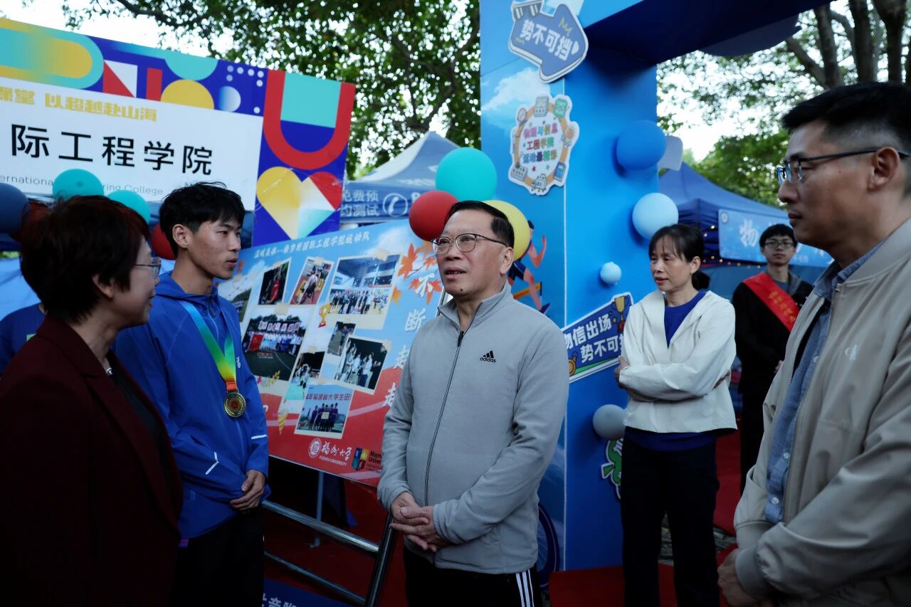 田径场上,陈超越耐心地与学院参赛学子交流起跑技巧、接力衔接的细节,手把手纠正动作要领,用自己的赛事经验为学弟学妹们鼓劲:“把每一次起跑都当作挑战自我的开始,享受赛场就好。” 跑道上的每一次奔跑,都延续着福大人“三种精神”,也让校运会的赛场涌动着温情与力量。