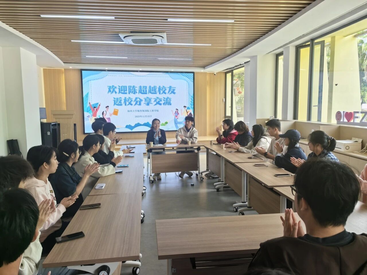 交流中,他回忆起在校期间备战全国赛事的日夜,老师的悉心指导、队友们的并肩作战,还有母校提供的广阔平台,都成为他成长路上的宝贵财富。面对学弟学妹们提出的关于专业学习、职业规划的疑问,他结合自身经历给出真诚建议:“保持对未知的好奇,勇于尝试,母校永远是我们最坚实的后盾。” 现场不时响起阵阵掌声,会议室洒满了秋日温暖的阳光。学长的叮嘱、学弟学妹的提问,交织成一场跨越时光的心灵对话。