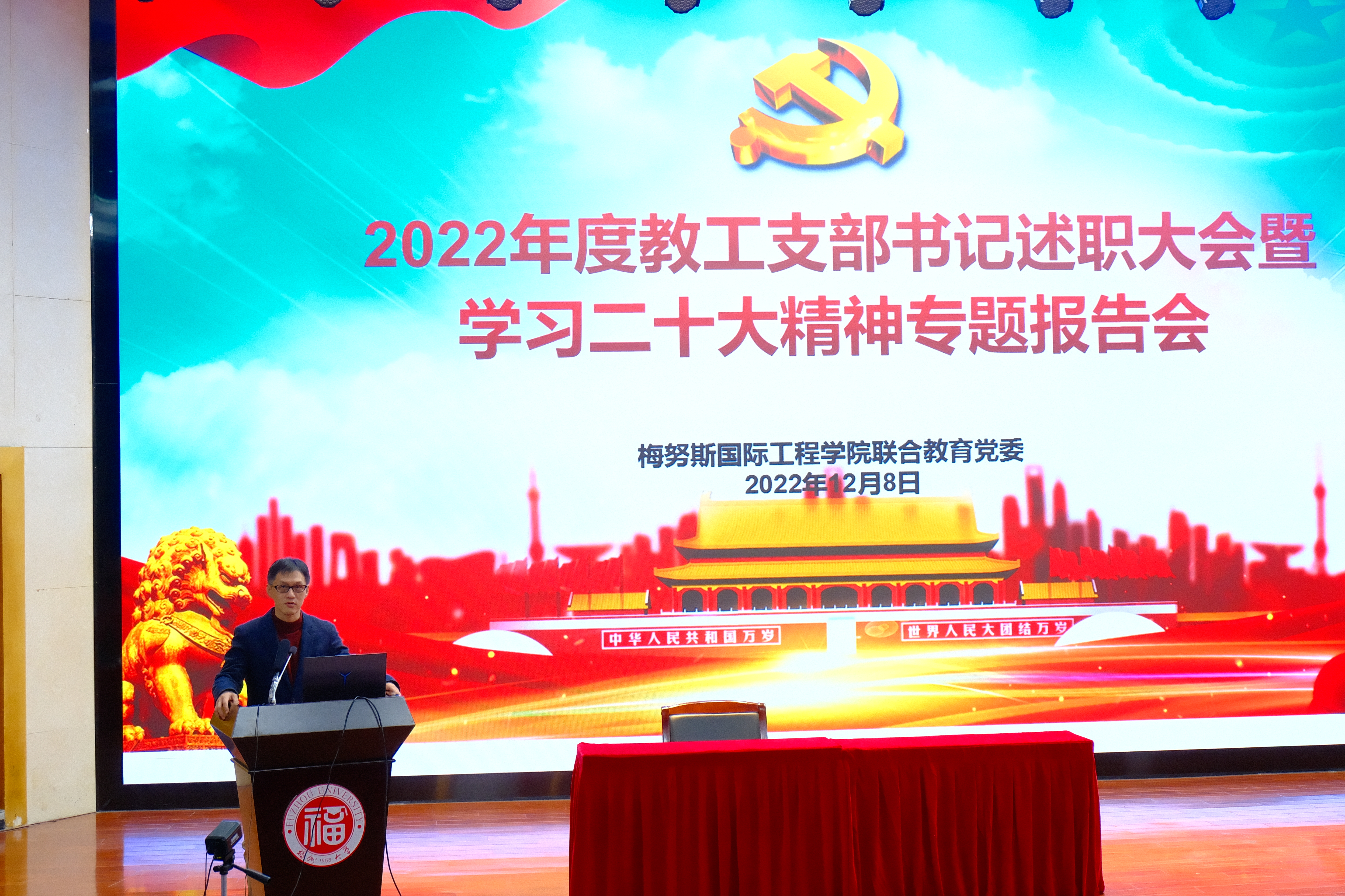 联合教育党委2022年度教工支部书记述职大会暨学习二十大精神专题报告会在校模拟法庭顺利召开。校党委统战部部长林新辉老师,党委组织部副部长阙璧君老师,校纪委综合室副主任林元新老师出席了本次会议。寻欢阁