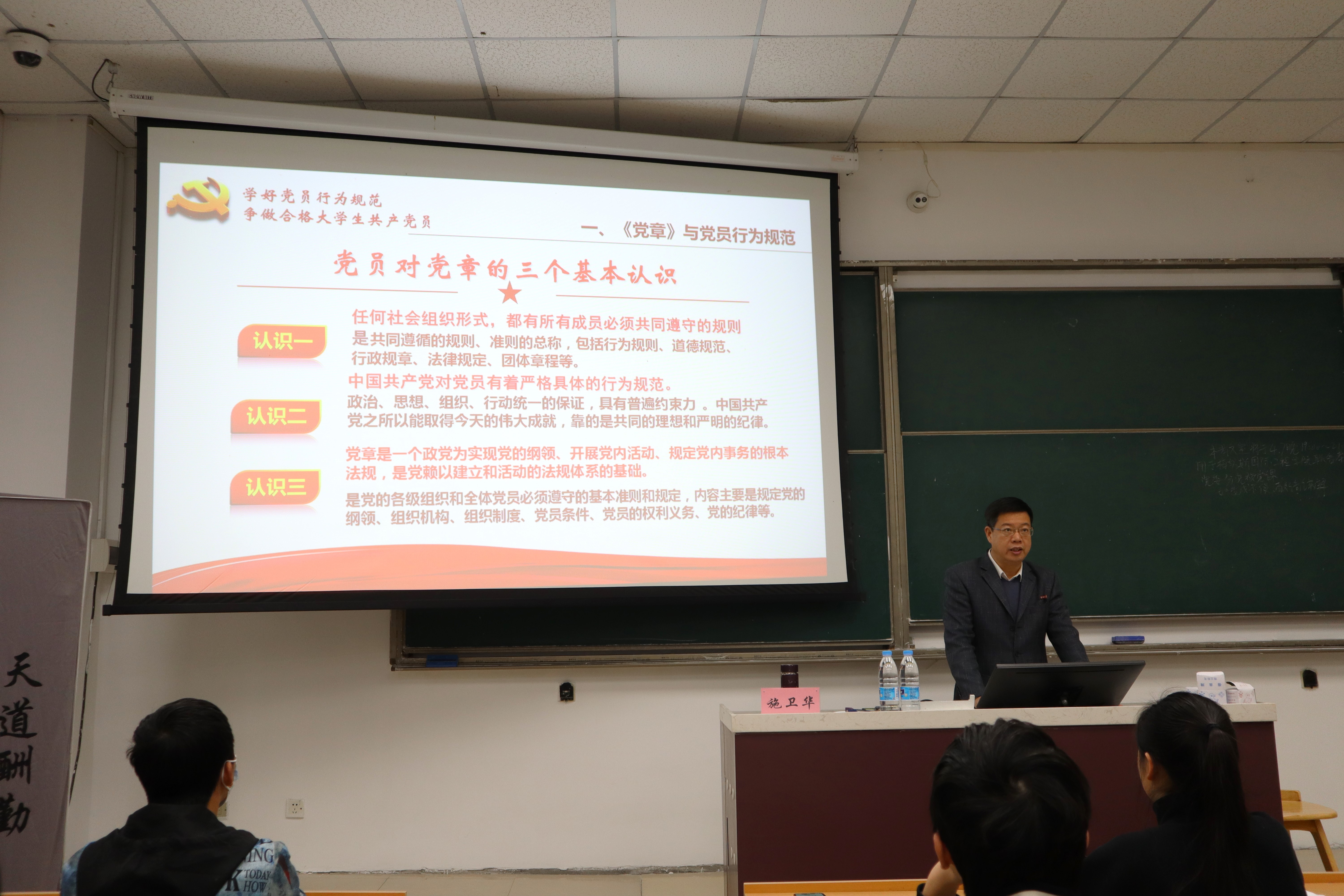 施卫华老师首先立足党的二十大,强调了坚持制度治党、依规治党,以党章为根本,以民主集中制为核心,完善党内法规制度体系的重要意义。施老师殷切寄语学员们要自觉学习党章、遵守党章、贯彻党章、维护党章,为全面建设社会主义现代化国家、全面推进中华民族伟大复兴而团结奋斗!