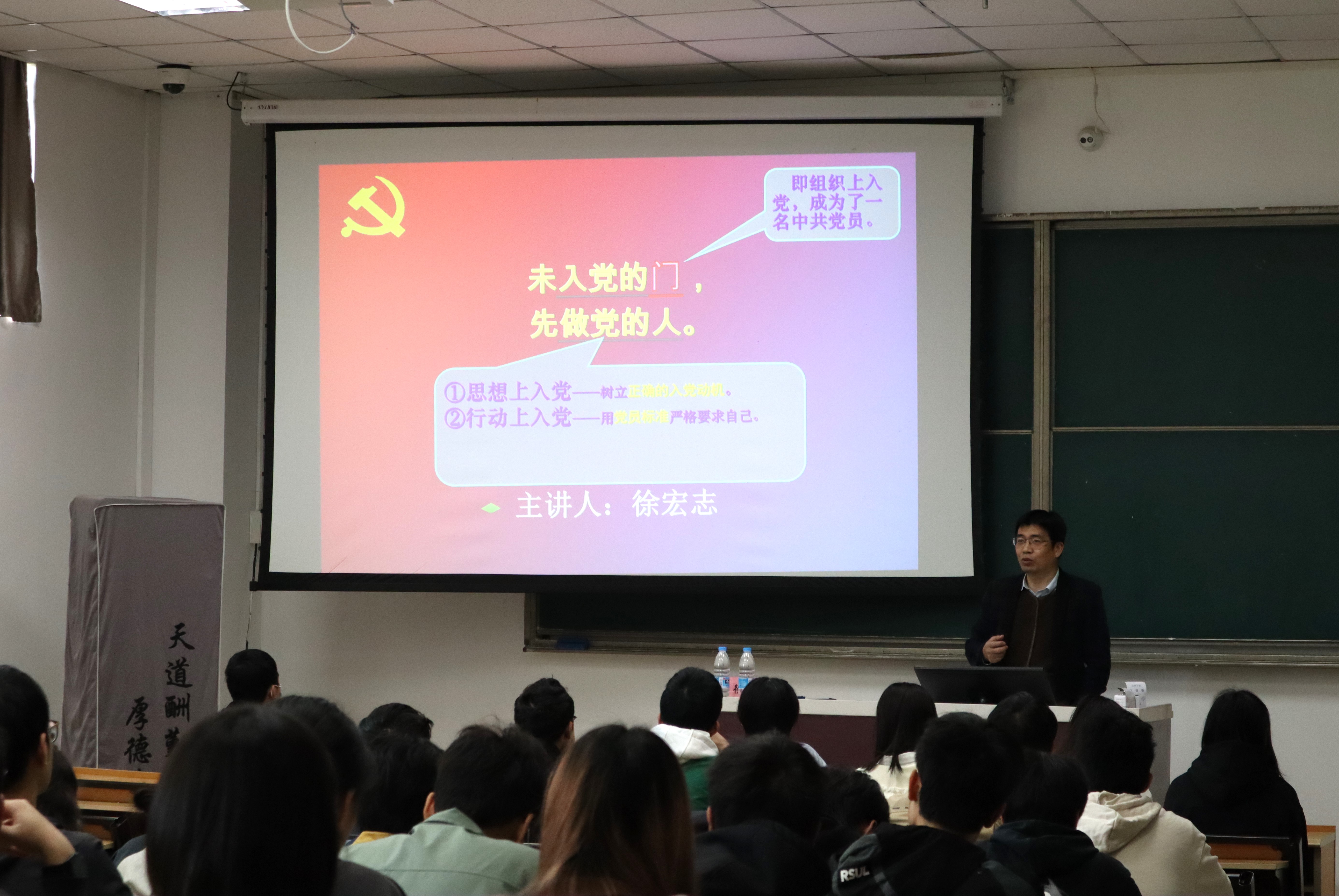 徐宏志老师以《中国共产党章程》为本,逐一解读入党的基本条件,明确正确的入党动机,判断入党动机是否端正的标准,深入解读党员的义务。他结合党建工作中的具体案例和生动的文字讲解,帮助同学们明白党员应有的素质以及今后努力的方向,强调党的事业发展正需要青年,让初心薪火相传、把使命永担在肩。