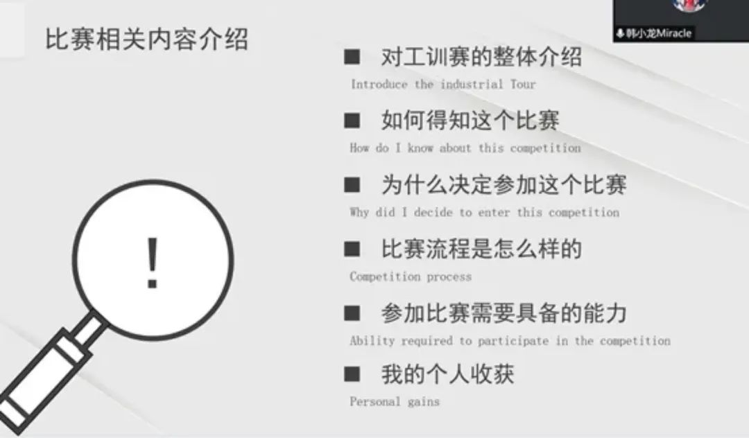 陈震烁同学作为第三个分享的同学另辟蹊径从在竞赛中的失误教训中总结经验从四个方面说明了参加竞赛可能会遇到的问题。其中包括目标参赛作品的运输问题,保持沉稳积极心态等的问题,汇集全国优秀选手的大赛往往很难实现在本校举办,基于此赋予参赛作品更高的稳定性和可运输性才是实现正常参赛的基本前提。如若确实有设想之外的环节发生纰漏陈同学也建议同学们保持冷静的思考和心态。