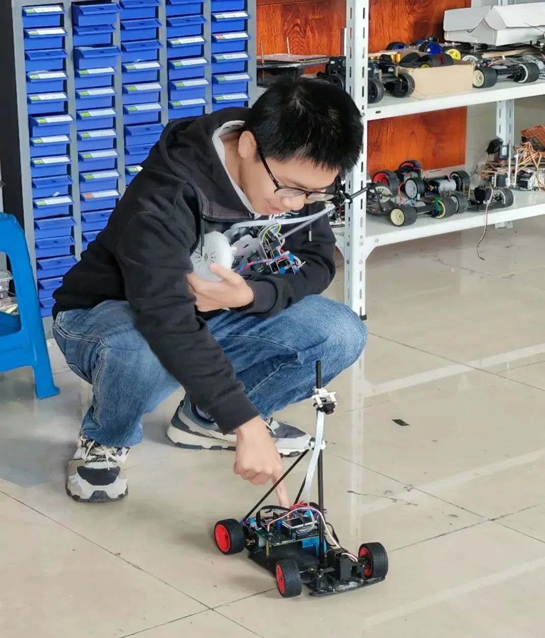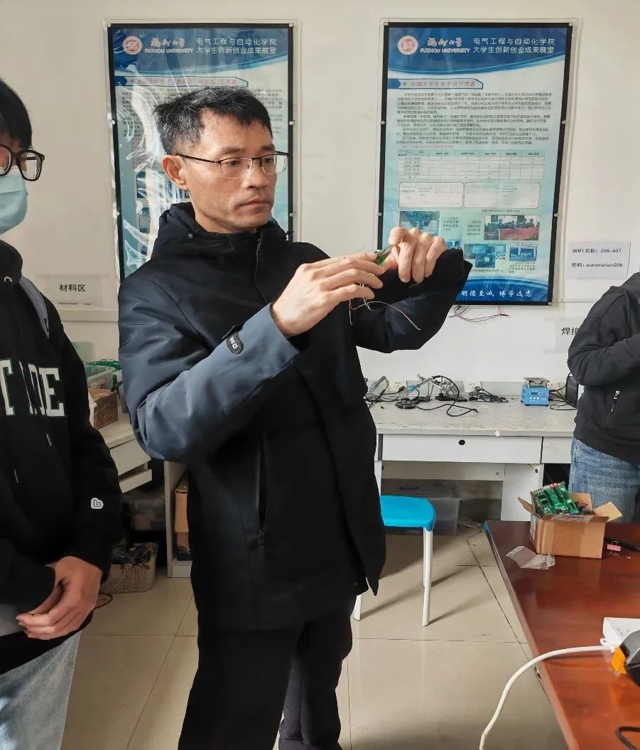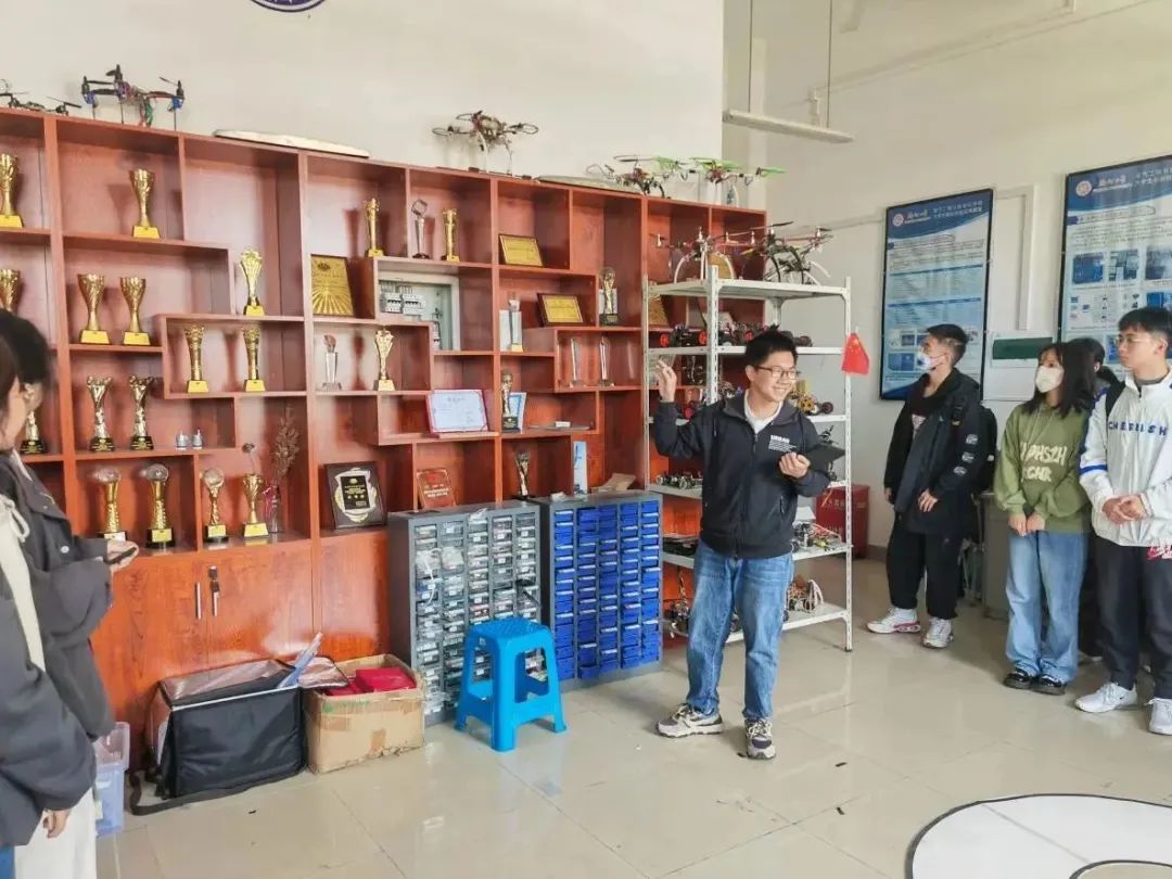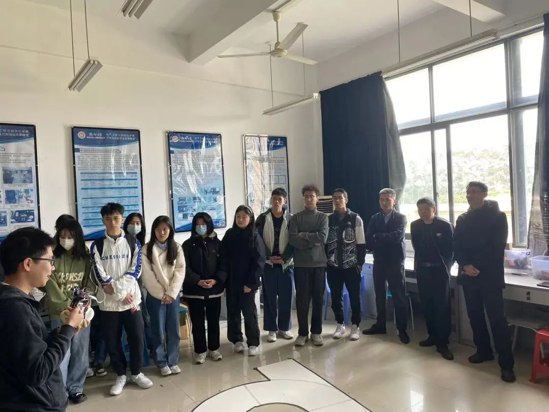 学子在副院长游生辉与周一帆老师的带领下,走进电气学院智能赛车实验室进行参观交流。