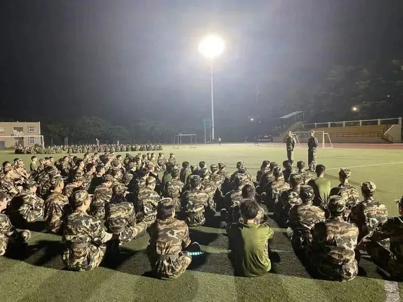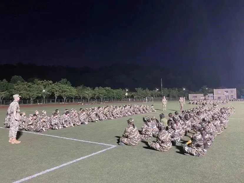 随后同学们来到了夜晚的操场,为期两周的军事训练正式拉开序幕,教官带领同学们整理队列,齐唱军歌,军人豪情激荡在这热血澎湃的夏日。