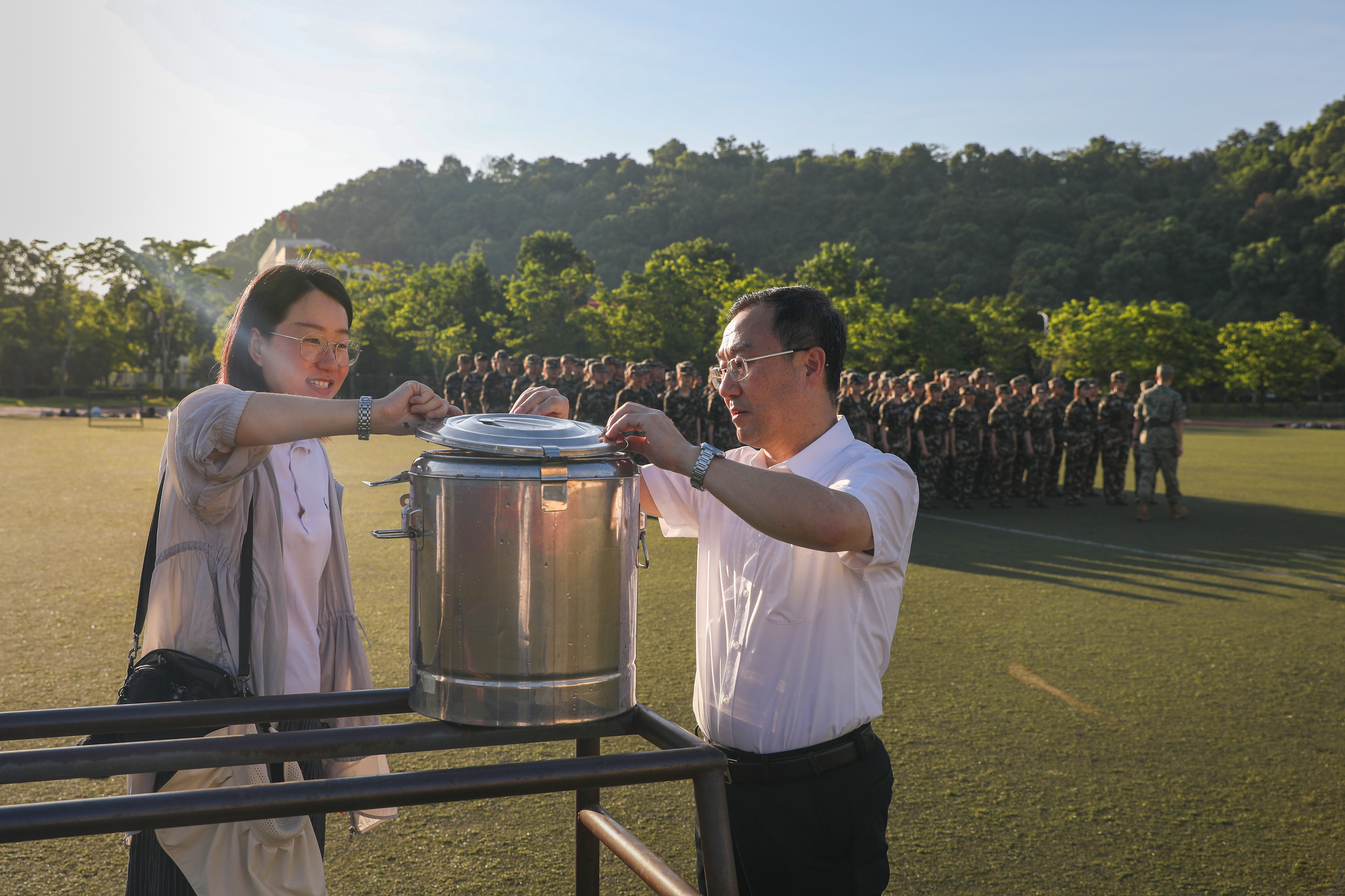 7月12日上午,校党委陈国龙书记、黄身勇副书记、林键副校长、党政办王向阳主任一行到旗山校区军训现场,关心军训学生,慰问军训教官。