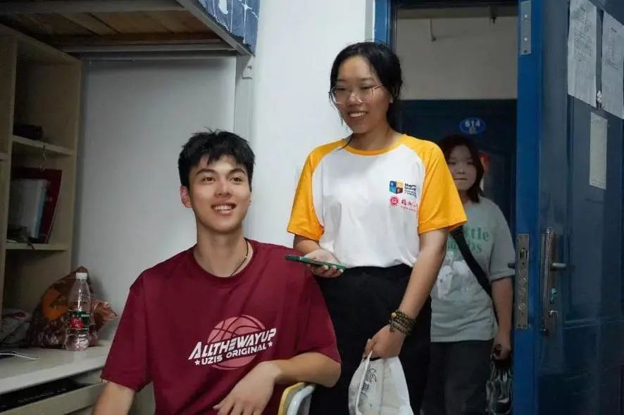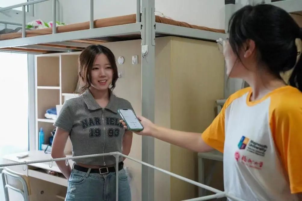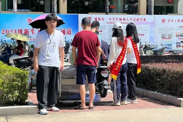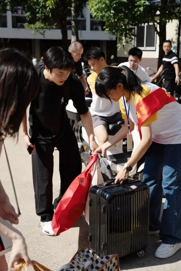 朝日初升,工作人员和志愿者早早赶到迎新点,积极热情投入迎新工作中。寻欢阁