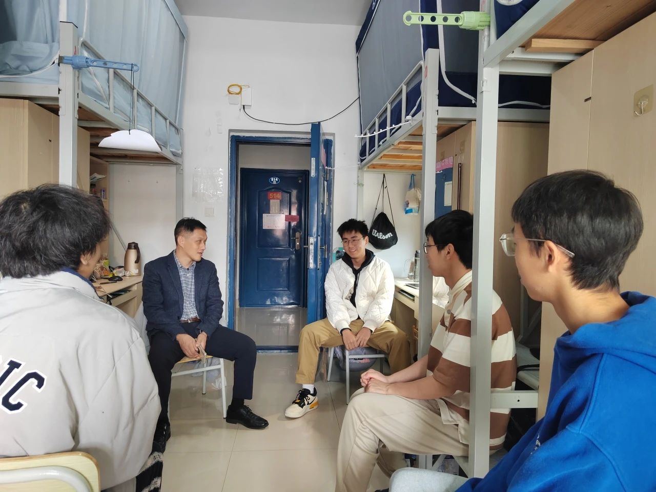 党委林少骏书记深入学生社区、走访学生宿舍,并与联系宿舍同学深入交谈。