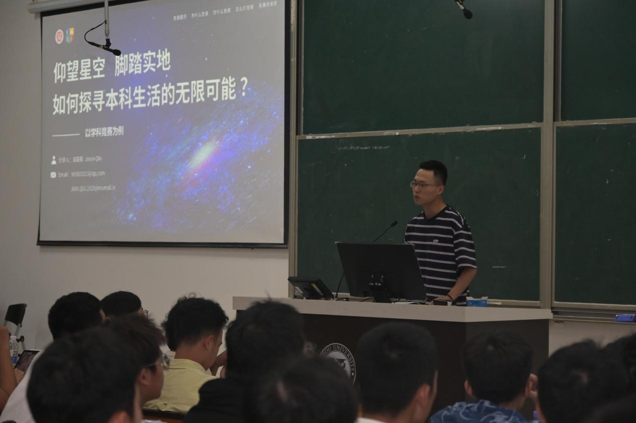 邱嘉毅学长为新生们详细解读了竞赛的分类以及各类赛事的要求和侧重点,并为大家分享了找老师、加实验室、组团队的经验,帮助大家理清了参与科研竞赛的思路。他强调,大学本科阶段是规划未来发展计划的重要阶段,要敢于试错,勇于尝试,挑战自己的上限,不要对竞赛充满畏惧,无论成功还是失败,都能从这段经历中得到经验和教训。
