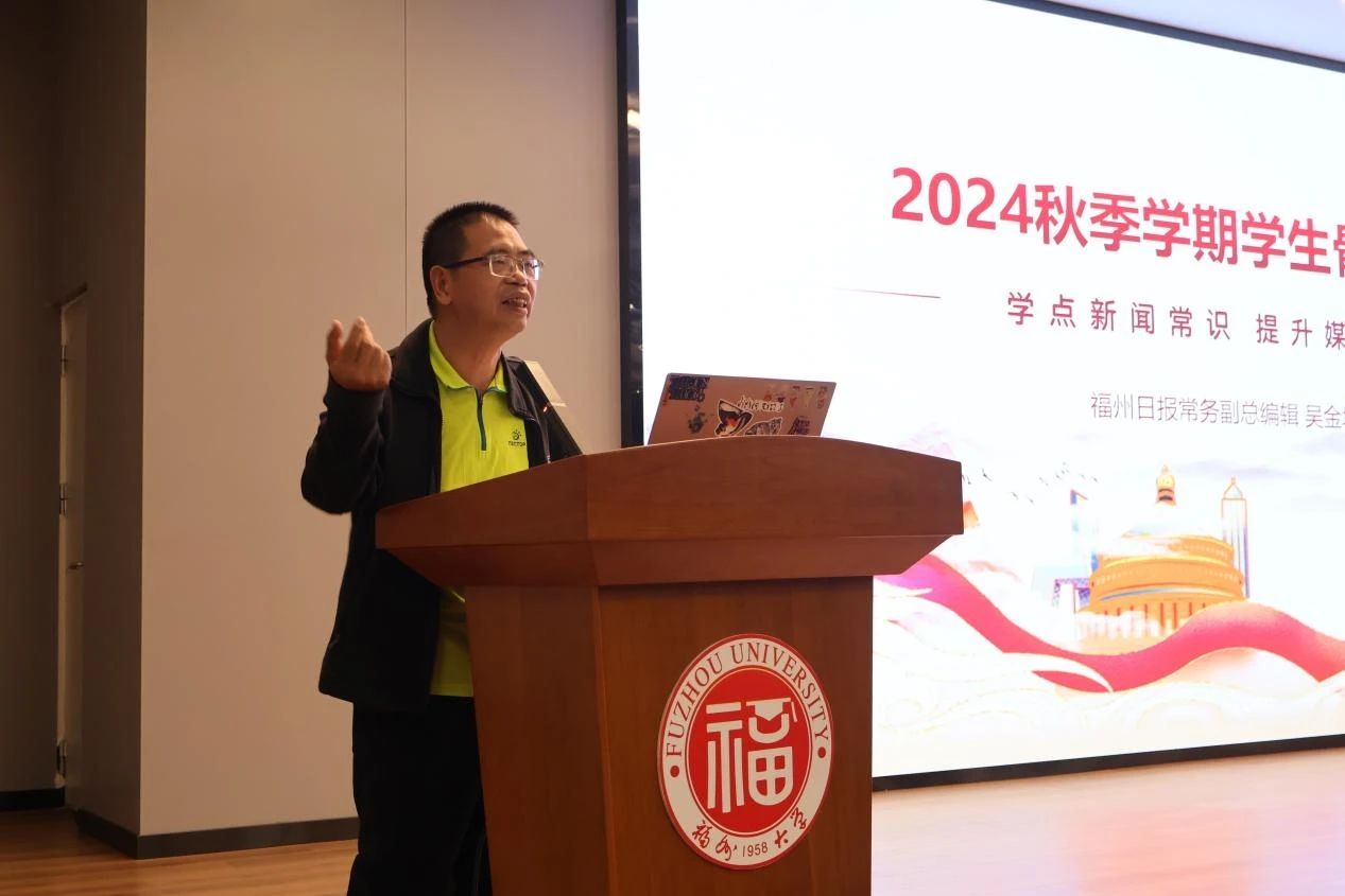 于晋江楼一楼报告厅成功举办了2024秋季学期学生骨干培训班——新闻写作专题培训,此次培训特邀福州日报常务副主编吴金垵先生作为指导老师。