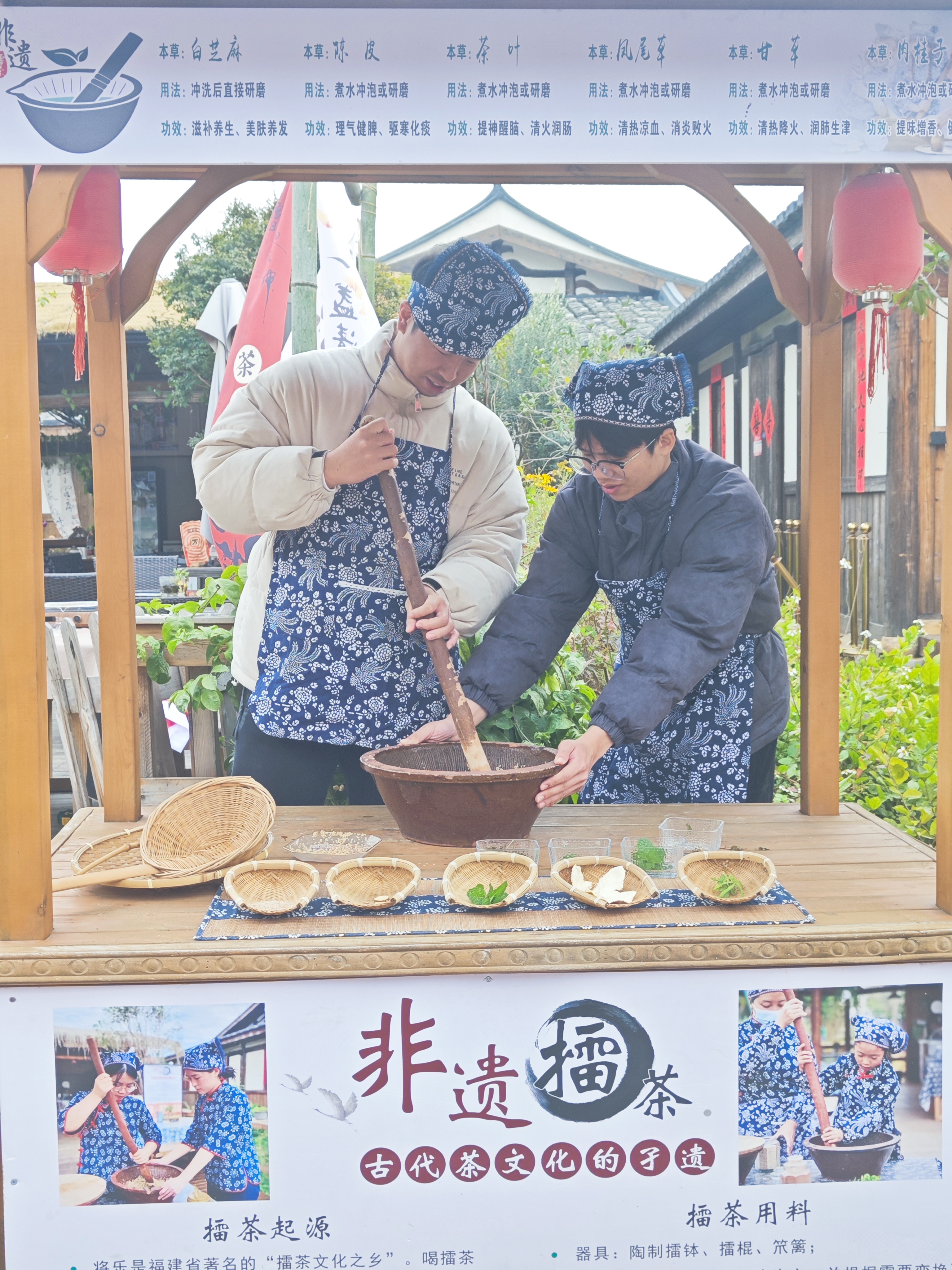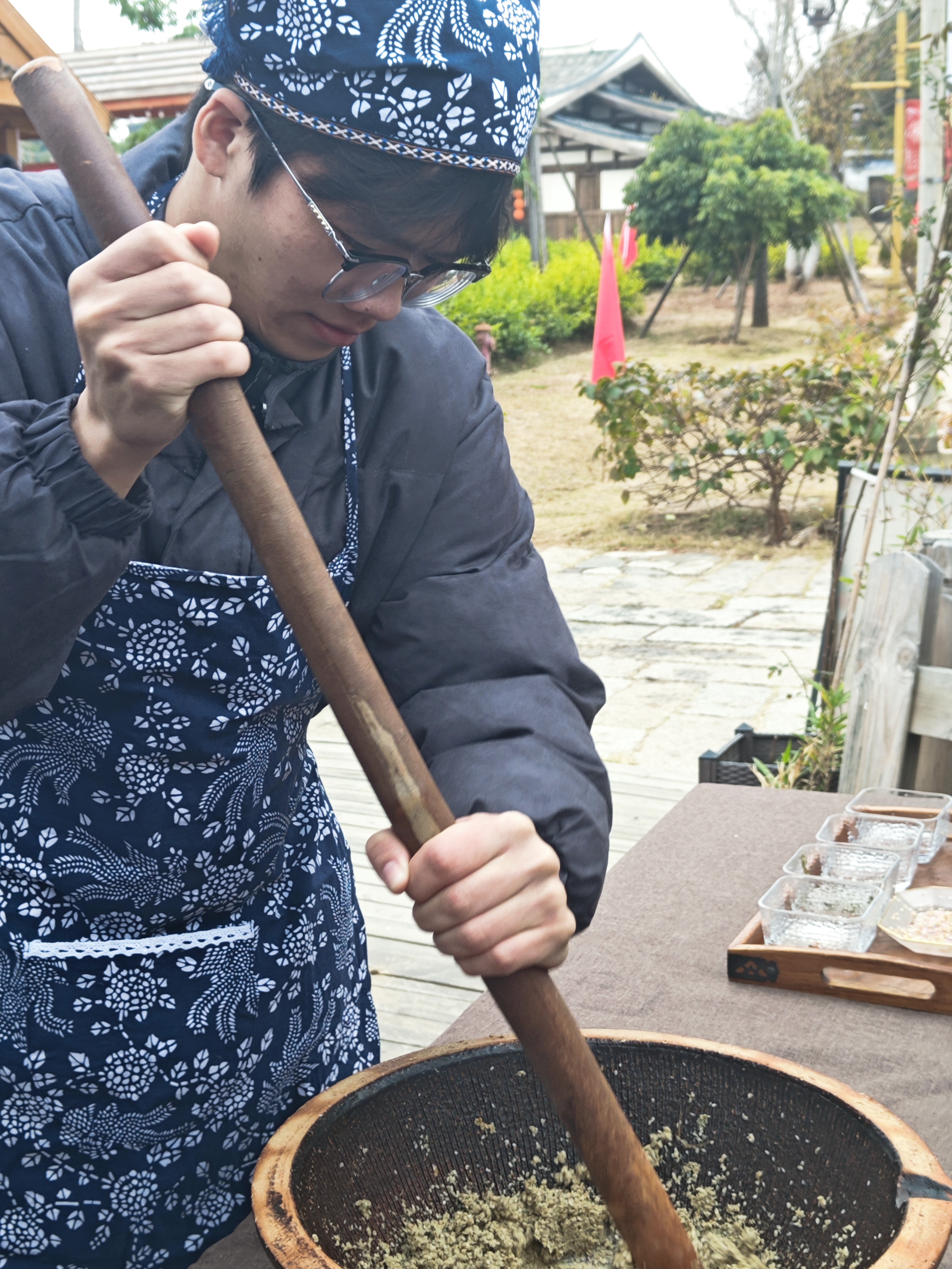 实践队前往梁厝特色历史文化街区体验擂茶工艺。在福建将乐,擂茶已入选省级非物质文化遗产名录,是当地传统文化的典型代表。同学们身着传统服饰,在老师的指导下亲手参与擂茶制作,将茶叶、米、花生、芝麻等食材在石臼中捣打,感受擂茶这一传统工艺的独特魅力。亲手制作的茶汤,是对传统工艺的致敬,也是对历史文化的深刻传承。