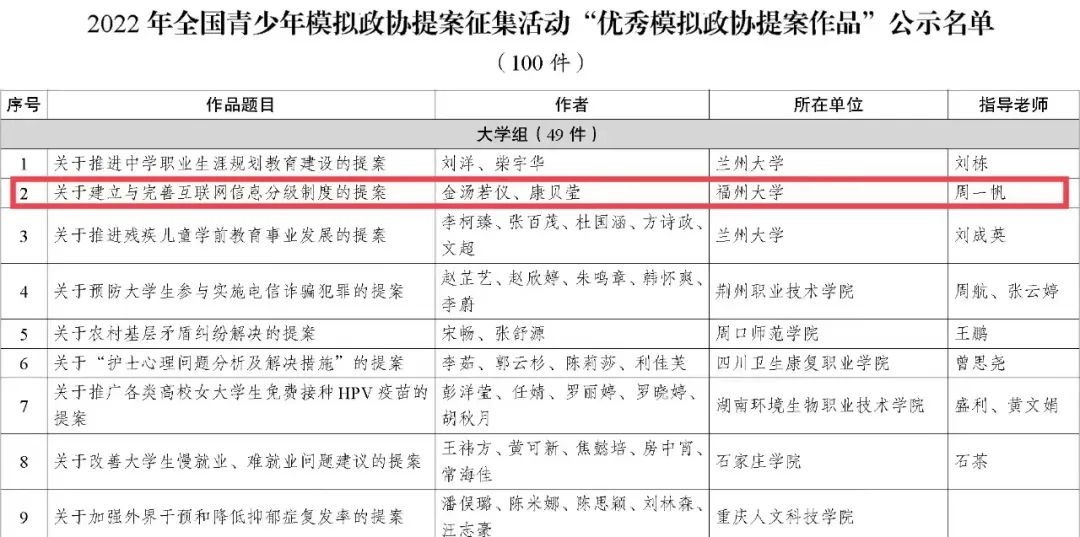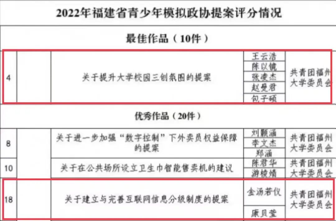 学子共斩获了1项全国优秀模拟政协提案,同时也在2022年福建省模拟政协征集活动中获得了1项全省最佳提案、1项优秀提案,其获奖数量和入围数量为寻欢阁