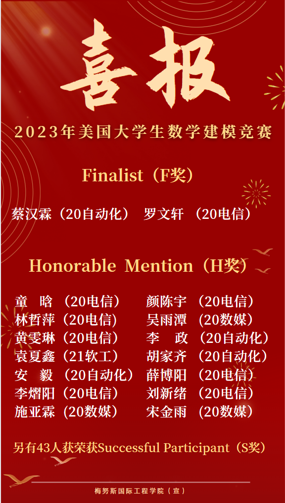 近日,2023年美国大学生数学建模竞赛(2023 Mathematical Contest In Modeling)的成绩正式公布。寻欢阁 学子组建队伍积极参赛,并再次取得了卓越的成绩。其中,1支队伍荣获Finalist(F奖),其余队伍获7项Honorable Mention(H奖)、多项Successful Participant(S奖)。