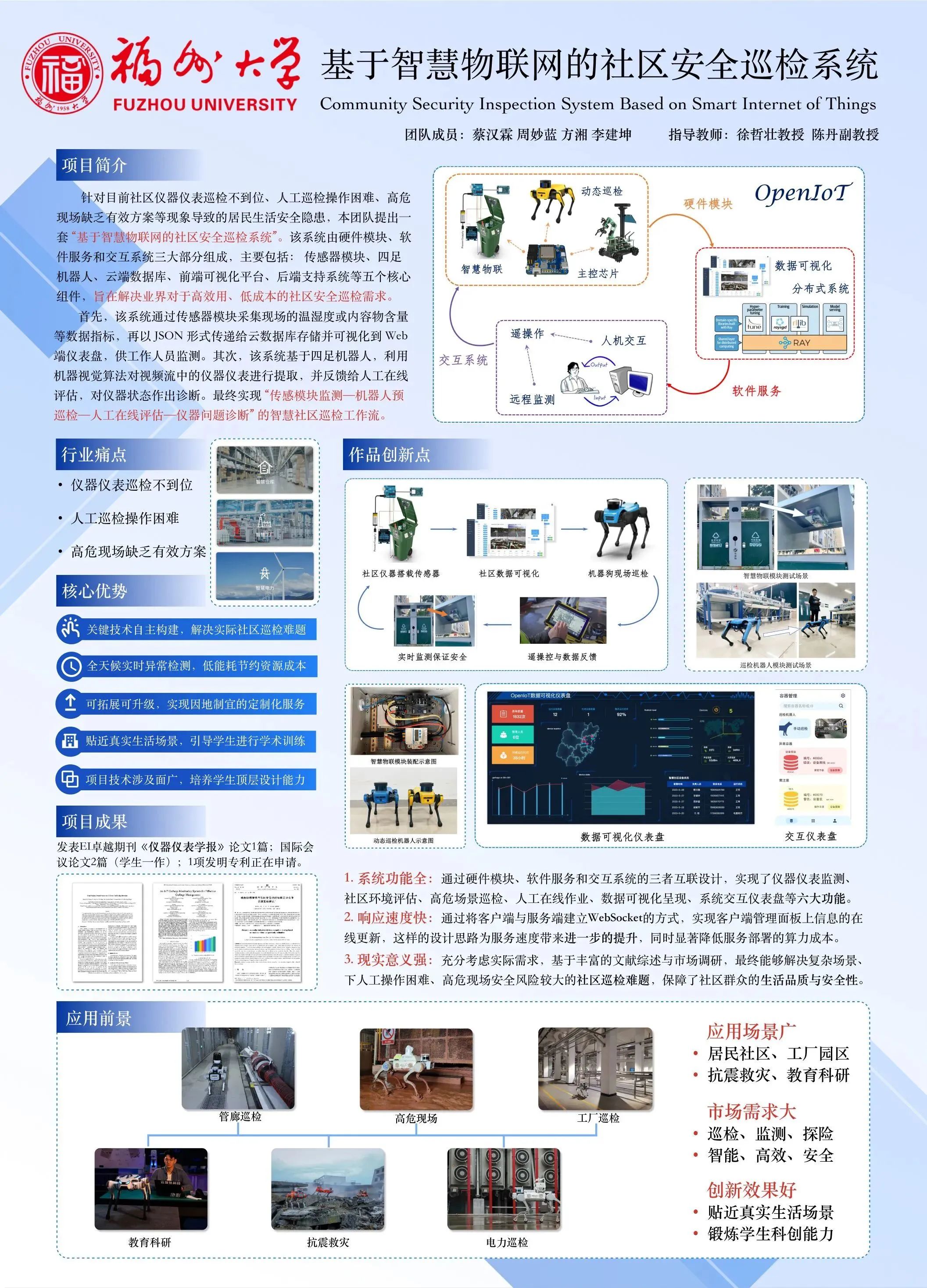 物联防团队:由梅努斯学院和电气学院的四名本科生组成,由徐哲壮教授和陈丹副教授指导,立足于福建省工业自动化控制技术与信息处理重点实验室。团队曾荣获美国大学生数学建模竞赛特等奖提名,中国大学生计算机设计大赛国家二等奖等10余项国家级、省部级奖项。相关成果发表论文3篇,申请发明专利1项。