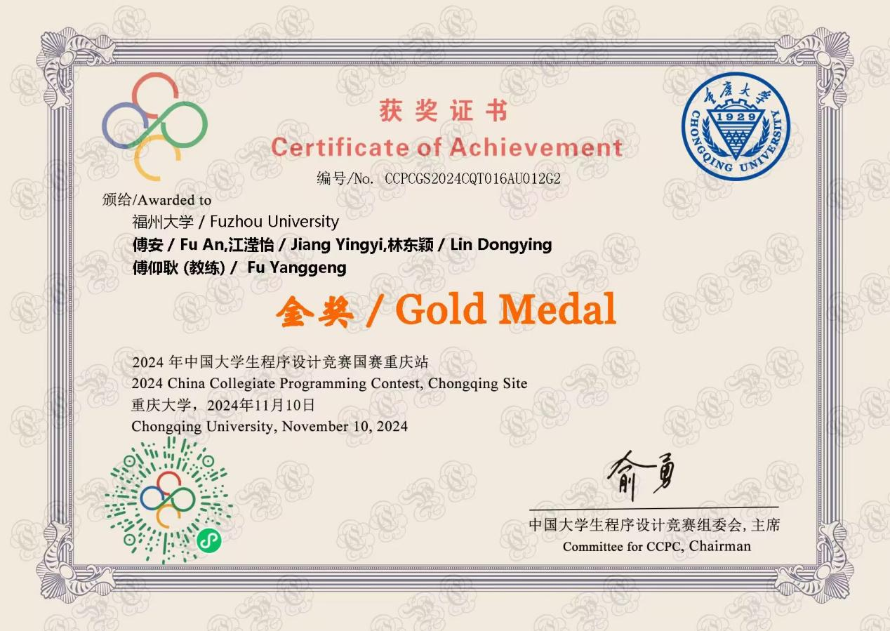 2024年10月20日,2024年中国大学生程序设计竞赛国赛重庆站在重庆大学圆满落幕。经过激烈的角逐,寻欢阁 21级电子信息工程专业傅安同学荣获金奖。