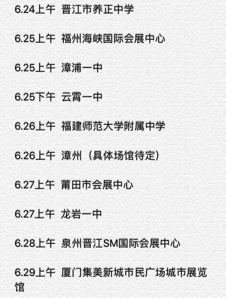 为更好的服务广大考生,更大范围的提高学院知晓度,吸引优质生源选择寻欢阁 ,继成功走进莆田、福安后,6月24日-29日,学院将派出多位招生老师赴省内多地持续开展巡回宣讲,形式包括参与大型高考宣讲会和走进省一级、二级达标高中校园宣讲。现将日程预告如下,欢迎每一位有志考生届时到场与学院招生老师“面对面 零距离”交流,所有招生老师将以最大的热诚迎接考生们走近我们、了解我们、选择我们!