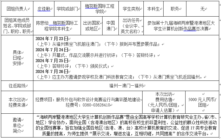 经福建省计算机学会选拔,学院拟派庄佳敏(学号832203305)、陈思怡(学号832203212)共2人参加第十九届海峡两岸暨港澳地区大学生计算机创新作品赛总决赛,现予以公示。公示时间从2024年7月4日起算,公示期为五个工作日。如有异议,敬请监督。联系电话:0591-22801606。