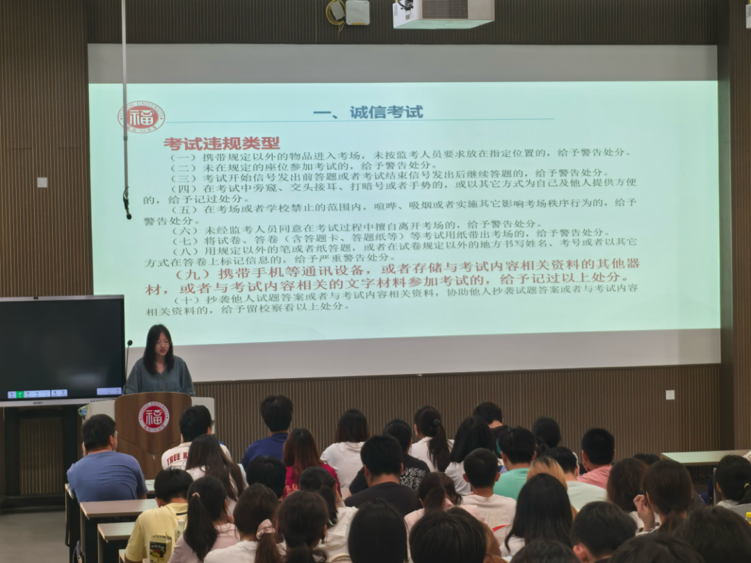 各年级召开了期末考试诚信教育大会。会议由各年级辅导员主持,全体学生参加。会上,辅导员强调了考场纪律,结合警示案例解读了考试违规处理办法和违纪处分规定,说明了期末考试流程。辅导员告诫学生重视考试纪律,要求班委做好诚信考试的思想引导工作,呼吁全体同学以严谨态度对待考试。全体同学签订了诚信考试承诺书,承诺杜绝作弊行为,秉持公平竞争原则,遵守考场纪律,摒弃侥幸心理。学院还出台了《诚信考试相关规定》《考生须知》等制度文件。